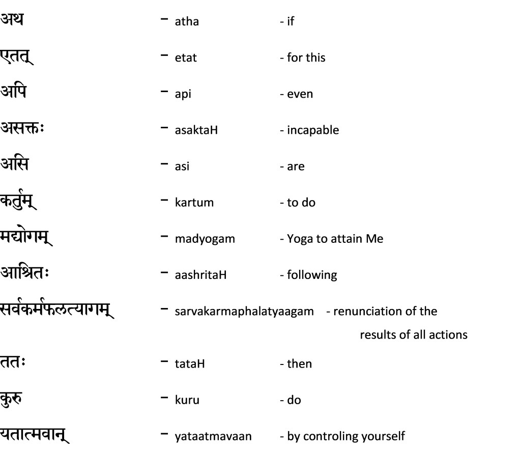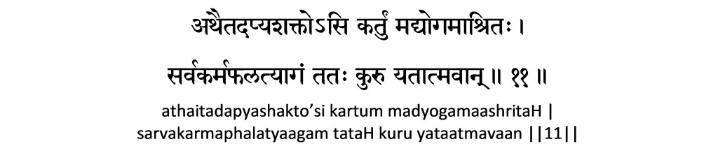 11. If you are incapable of performing even this (performing actions for Me), then be self-controlled, and taking refuge in Me, renounce the results of all your actions to Me.