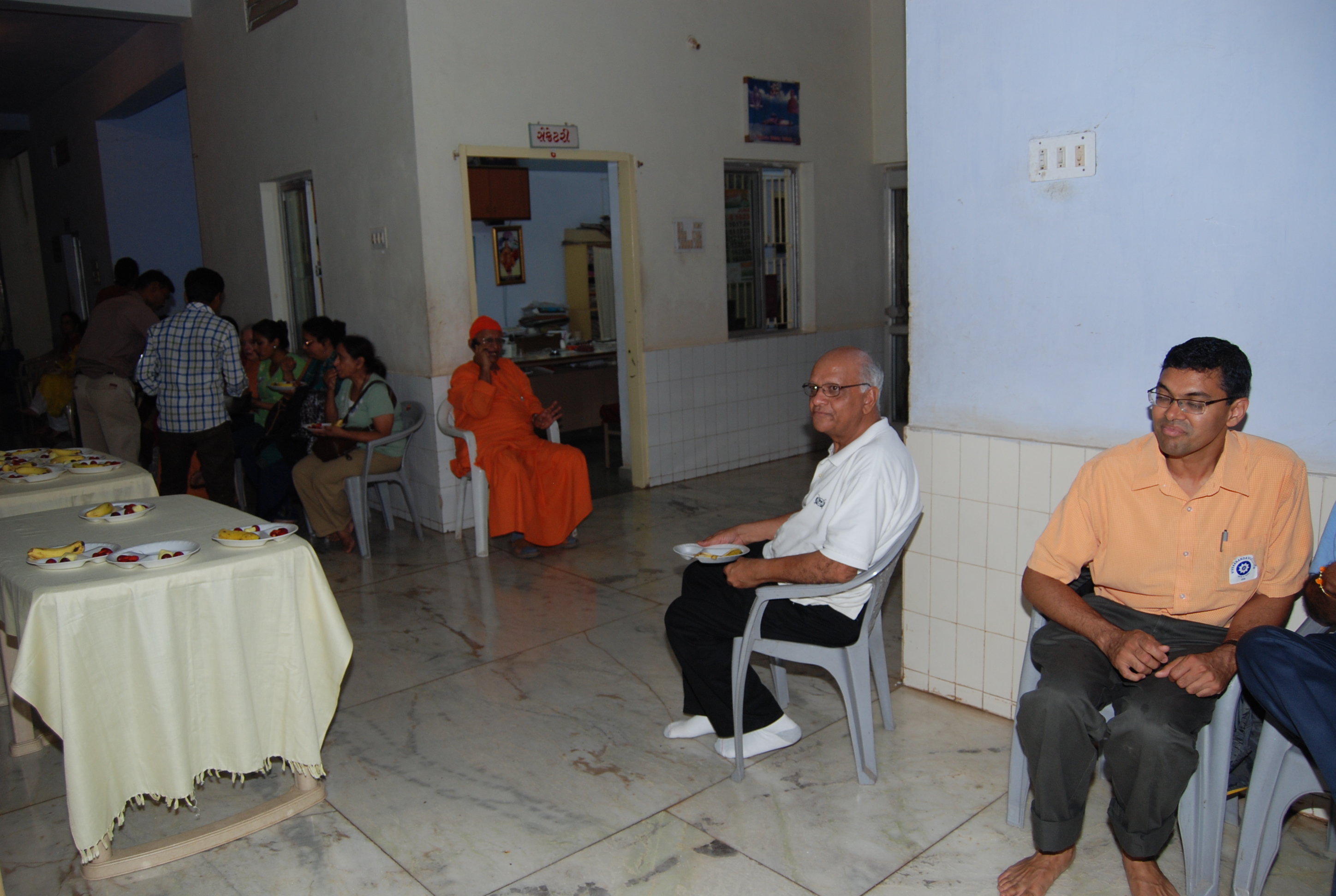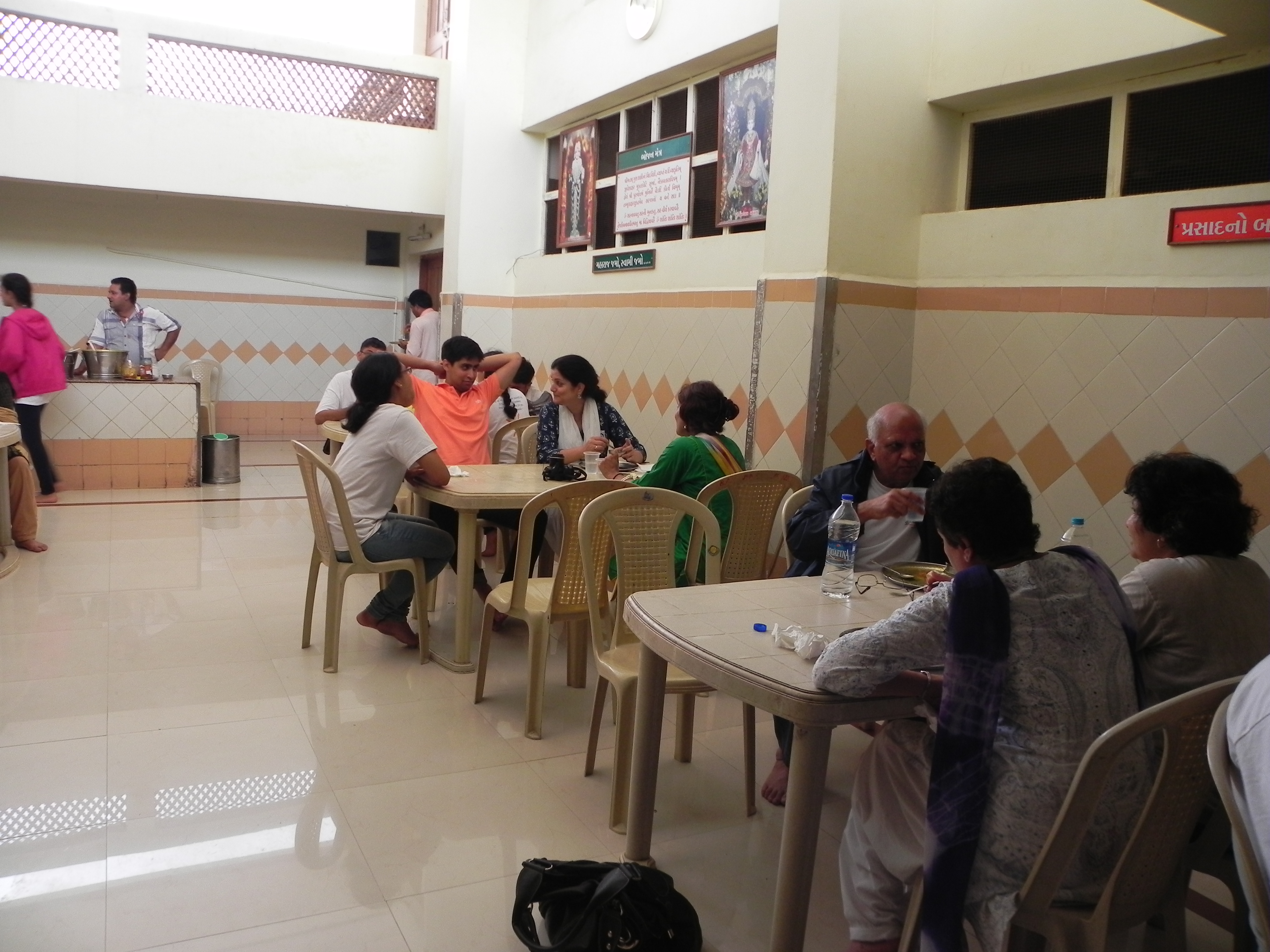 Nilesh and Apexa hosted a fun dinner at a pizza restaurant in Vadodara, and the Parikh family hosted a dinner in Porbandar. Jaymeenbhai, Nixitaben, Nayanaben, and Truptiben took care of the snacks for our trip. Our four doctors were constantly helpful, taking care of patients and making sure we were taking good precautions. All others helped in various ways and were ready to help whenever need arose. Having spiritual background, there was no ego creating any problem. Everyone followed the guidelines. One outsider said that having so many people together for few days and not having a single dispute, that itself is a big achievement. It was a group of happy people. They were happy within, so external adjustments did not bother them.