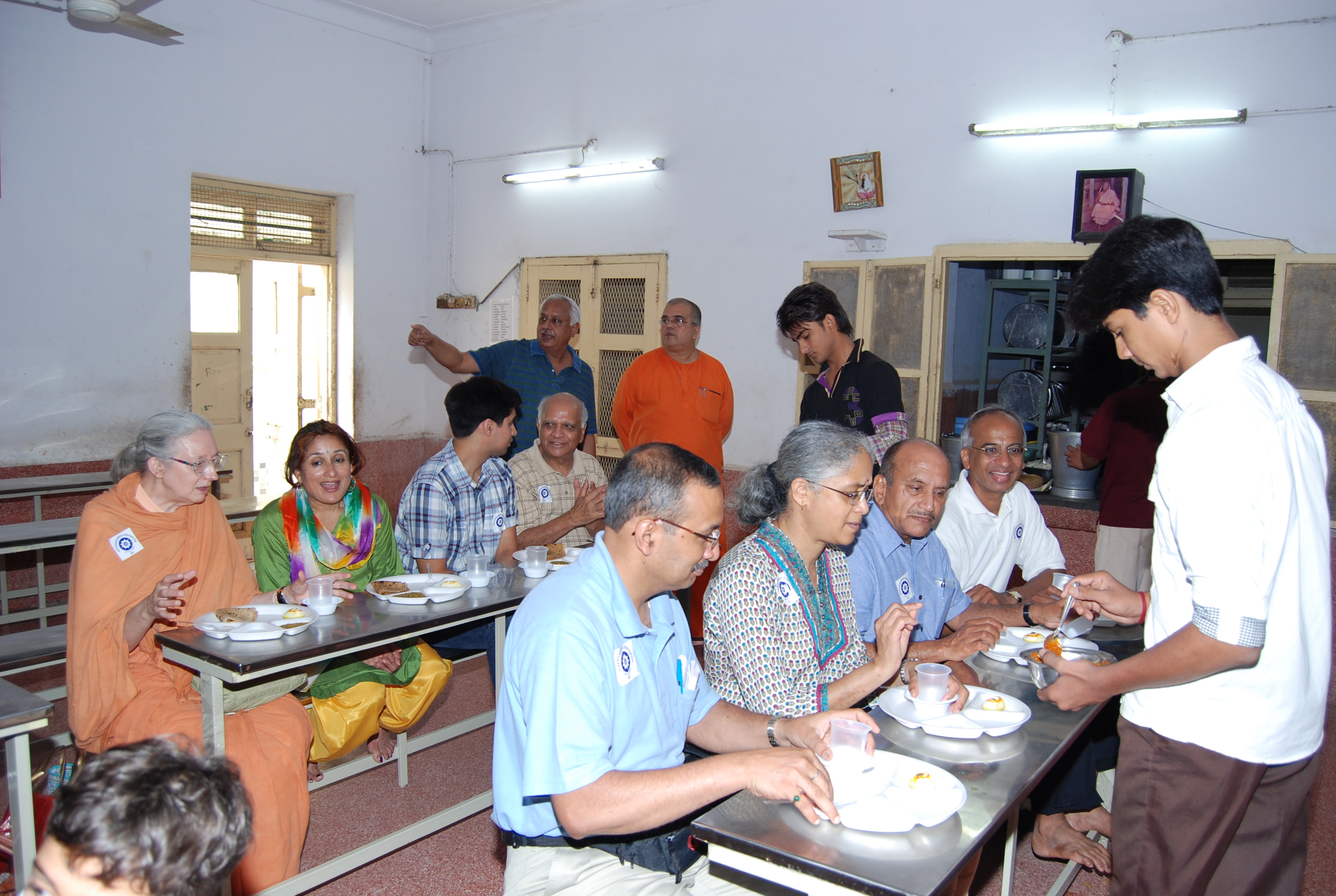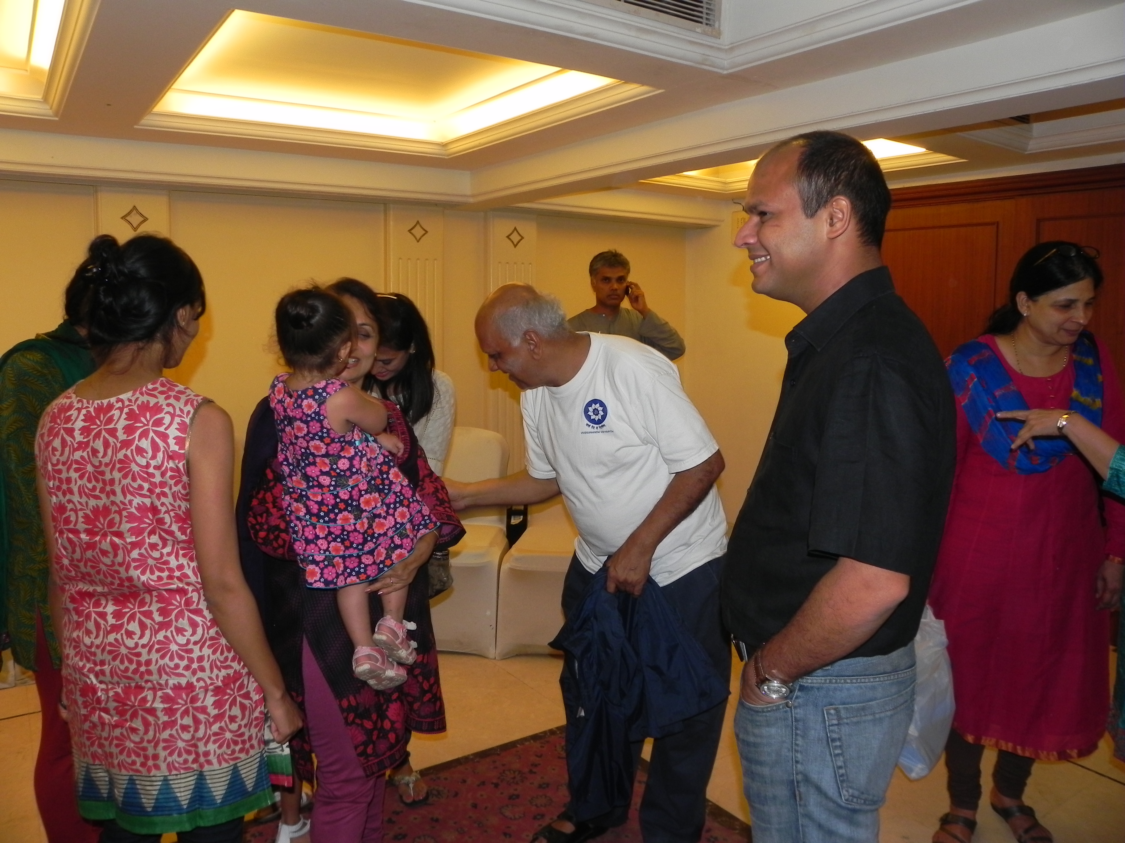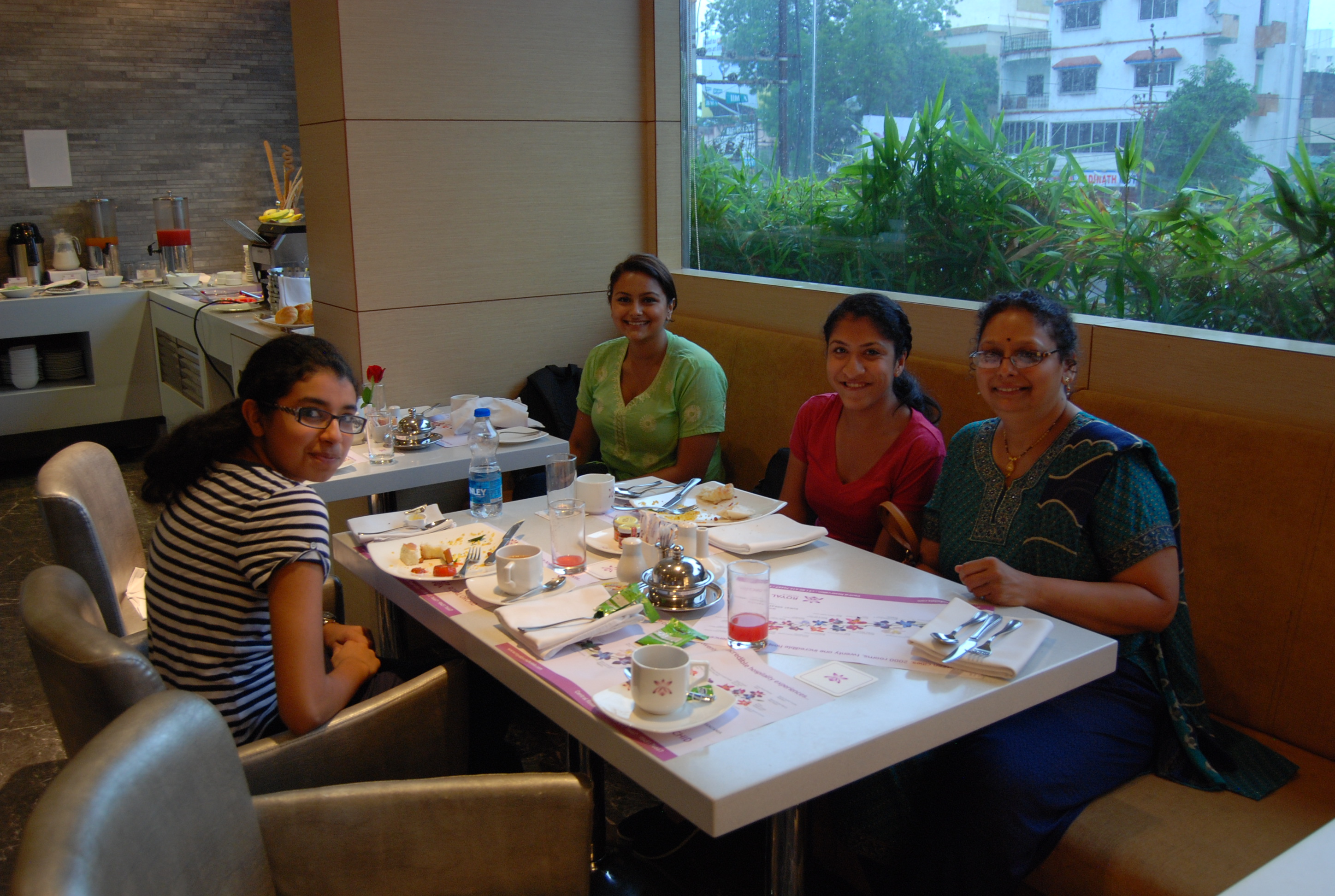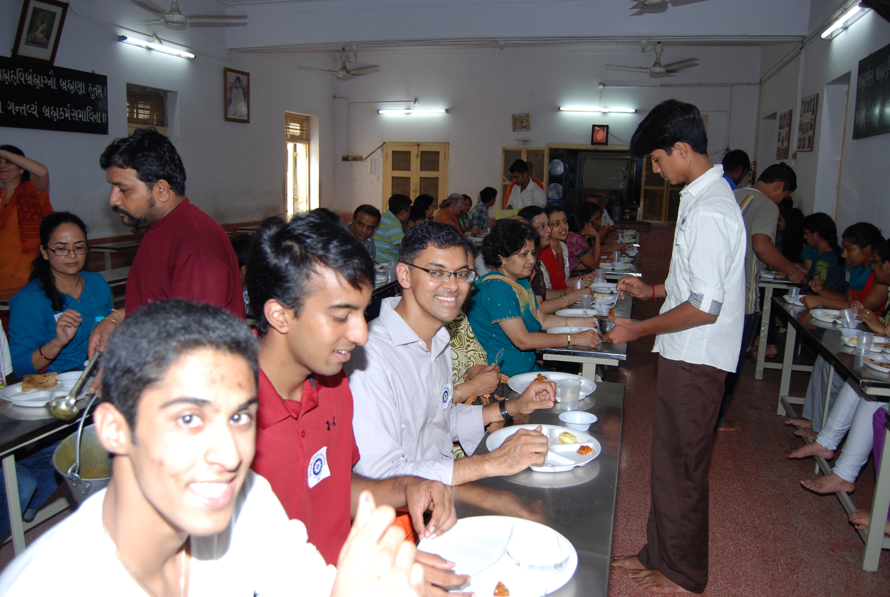 Nimishkaka or Nimishbhai, researched and bargained with all the hotels in the cities we visited. He was in constant communication with hotel owners and managers, and he even visited some of the hotels beforehand to see how they were. After we selected hotels he made all the reservations on our behalf. Nimishbhai took care of all our transportation logistics and anything we needed. He would always tell us to let him know if there was any work. One day, at the last minute we found out that Hotel Royal Orchid Central could not provide us a space for practice. Immediately, Nimishbhai arranged a big hall at a nearby club for our practice. Then, he was worried about our drinking water. He, himself, brought a huge package of large water bottles and carried them all the way upstairs. He was thinking of our needs ahead of time and got them done on time with a smile. He and his family hosted our lunch at Sankalp.