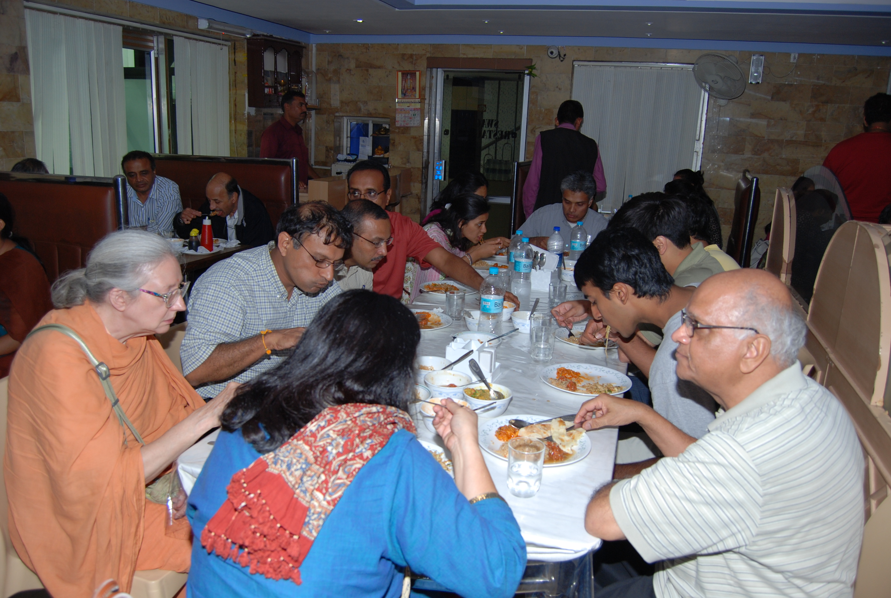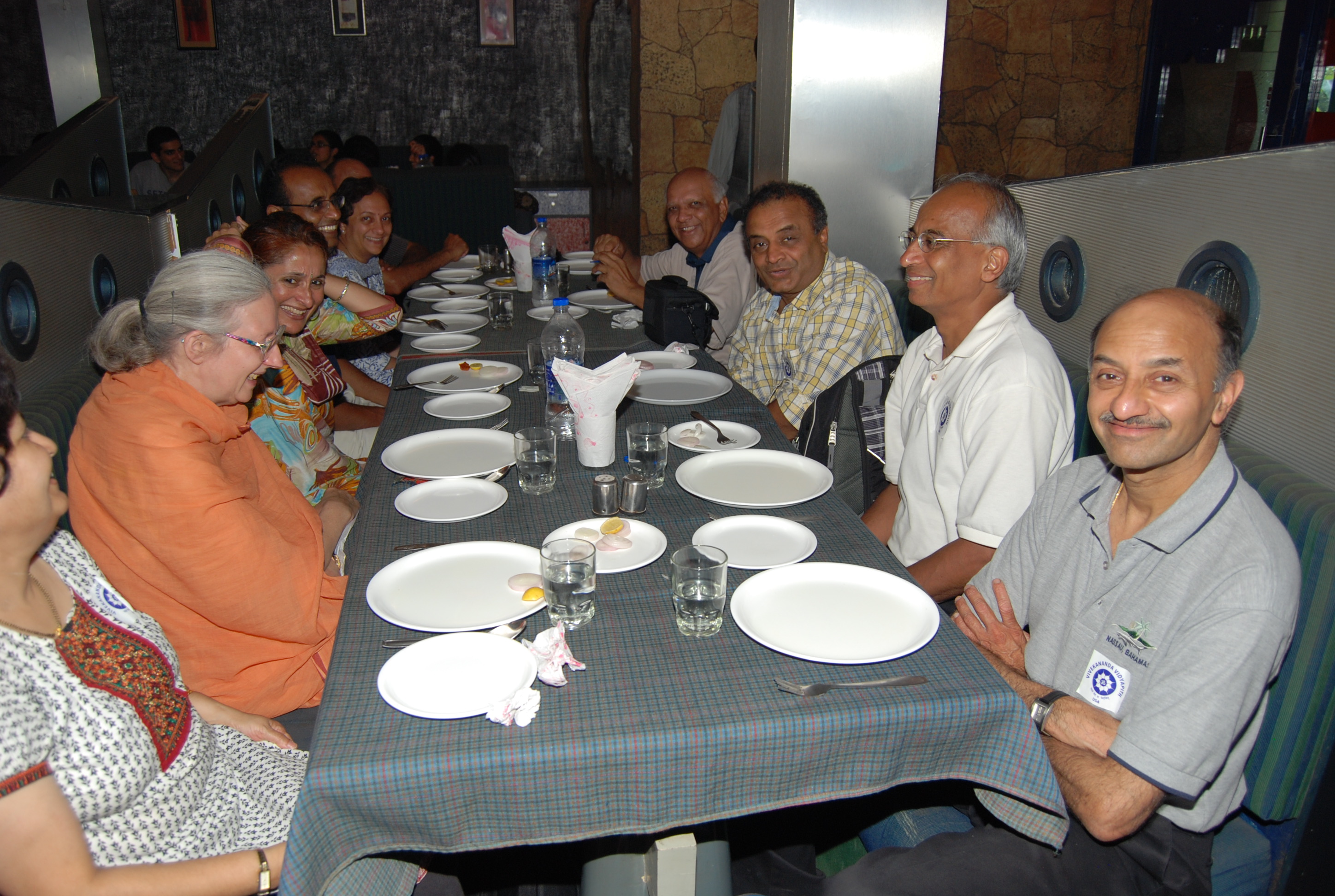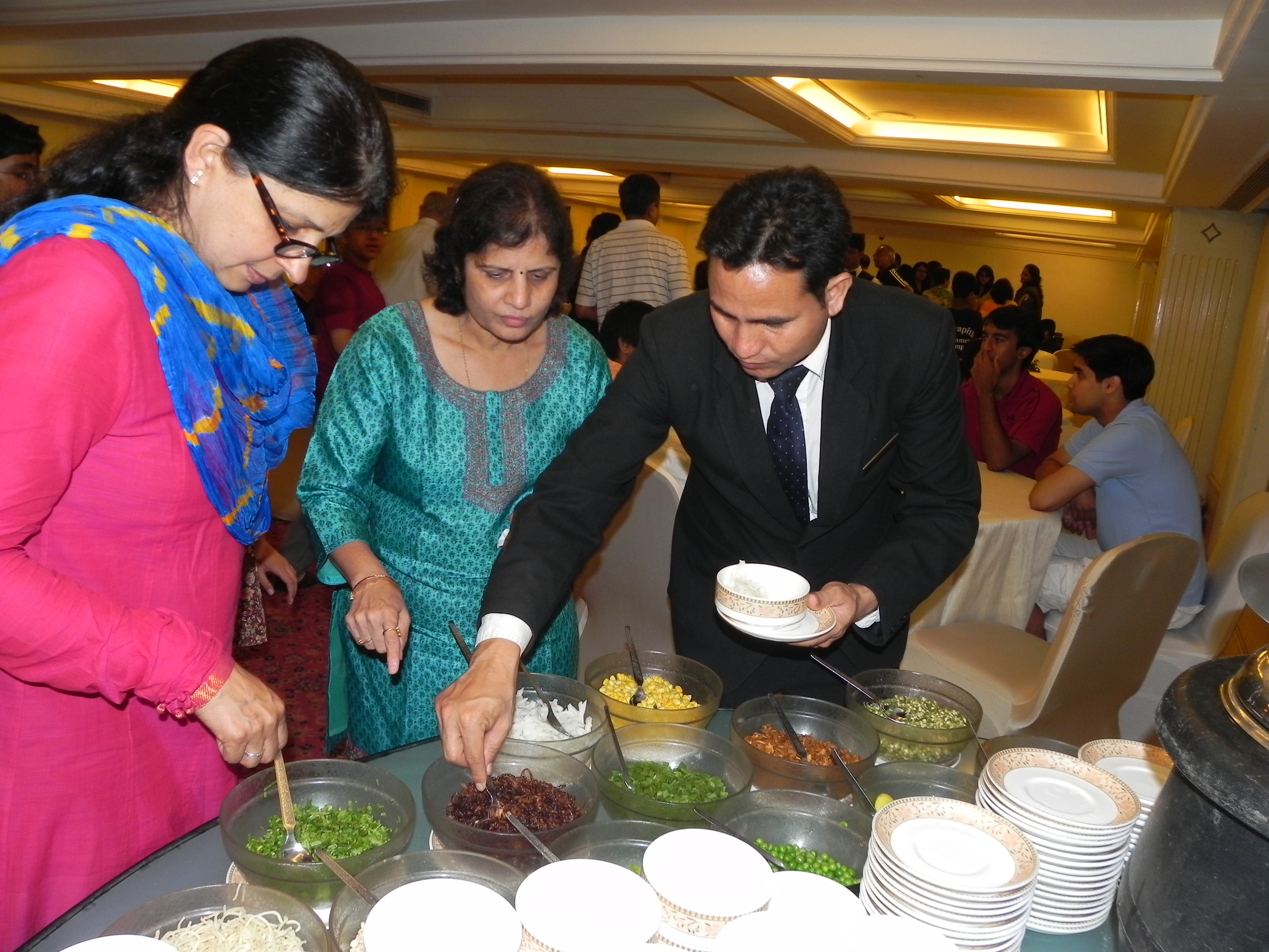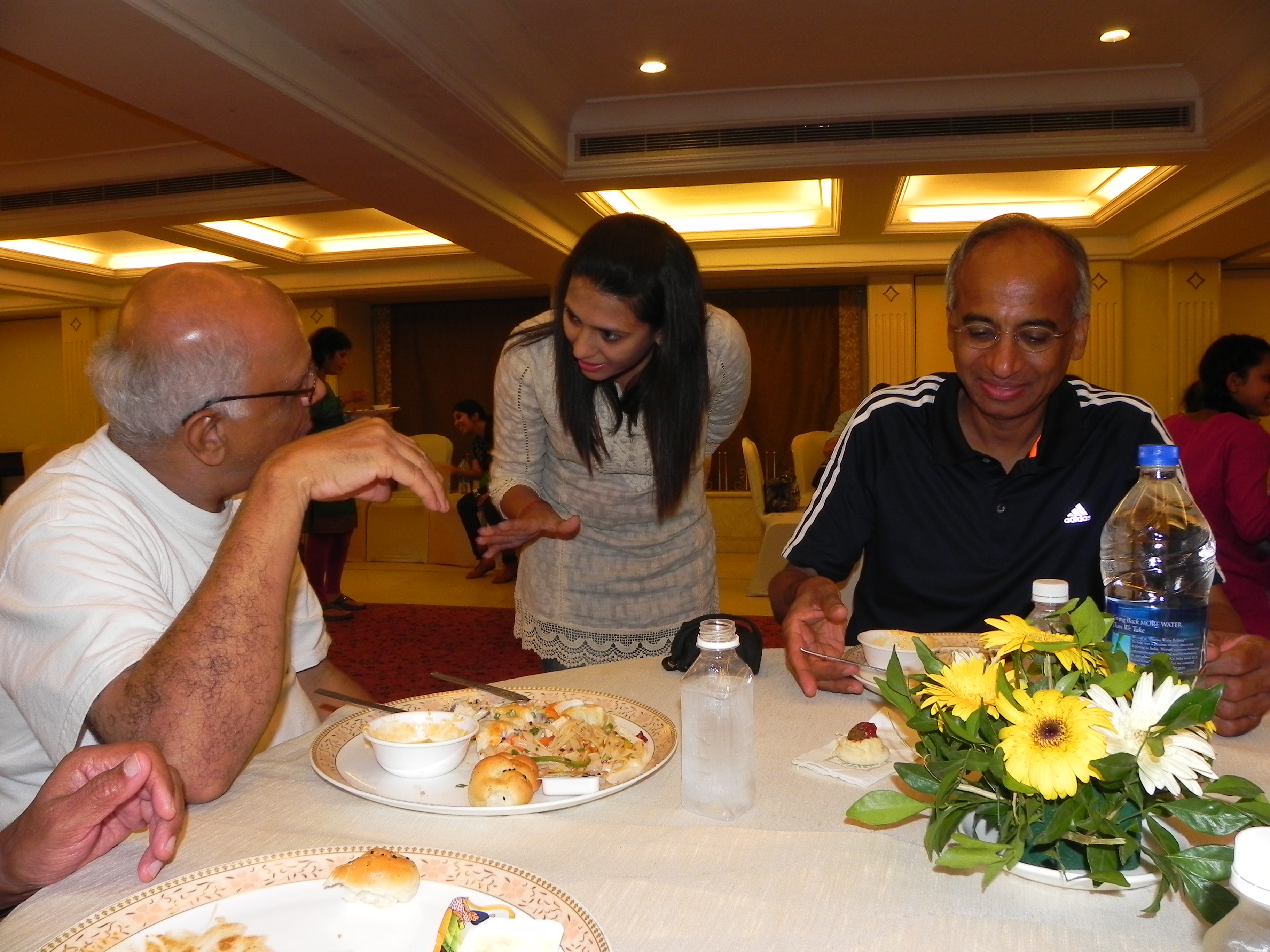 Within half an hour we arrived at the Surya Hotel. As soon as we entered into a decorative and well-lit reception room, we found a sign that said, “Welcome to delegates of Vidyapith Family, New Jersey. @5th Avenue Hall (5th floor)” We went to the 5th floor and there was a similar sign at the door. It was a special dinner. The dinner was hosted by Mukundbhai and Maltiben & Family. They welcomed us inside a big banquet room. Decorative table-cloths, chairs covered with white covers, special lights, and people created a very good mood for dinner. Some soft drinks were served. People got some time to talk to each other. Soon, the room was full of joyful noise. Nisha introduced the host family members. People then enjoyed appetizers, the main course menu items, and deserts. There was a family oriented environment in the hall. After desert, everyone received a gift of the book, “In Indian Culture, why do we…” All were very happy by the loving hospitality of the host. While going home, there was no bus and because of rain it was difficult to get many rickshaws. So, Nimishbhi and Mukundbhai’s son Kunalbhai gave rides to all of us from the Surya hotel to the Royal Orchid Central hotel. For this, they had to make several trips between the hotels.