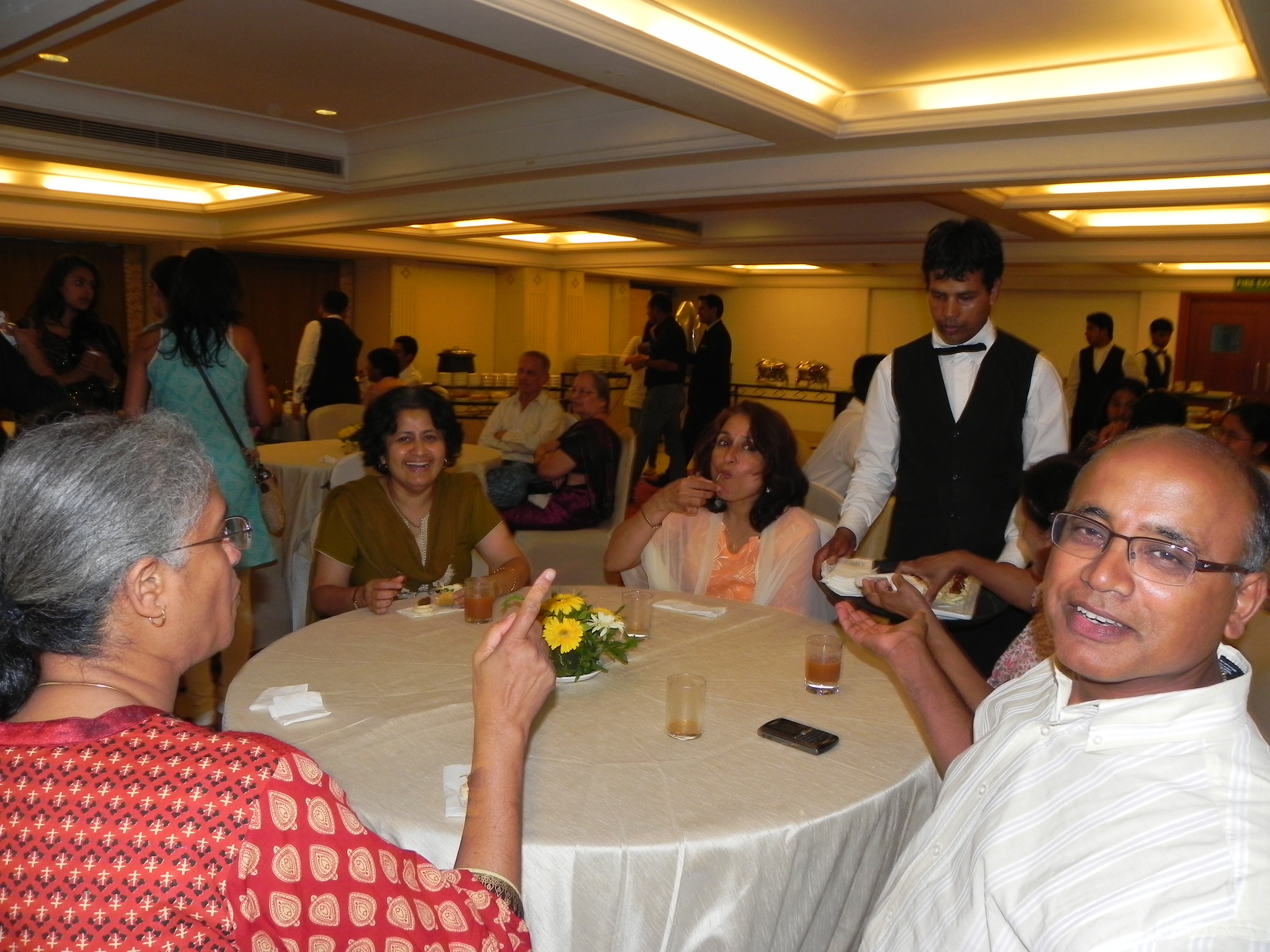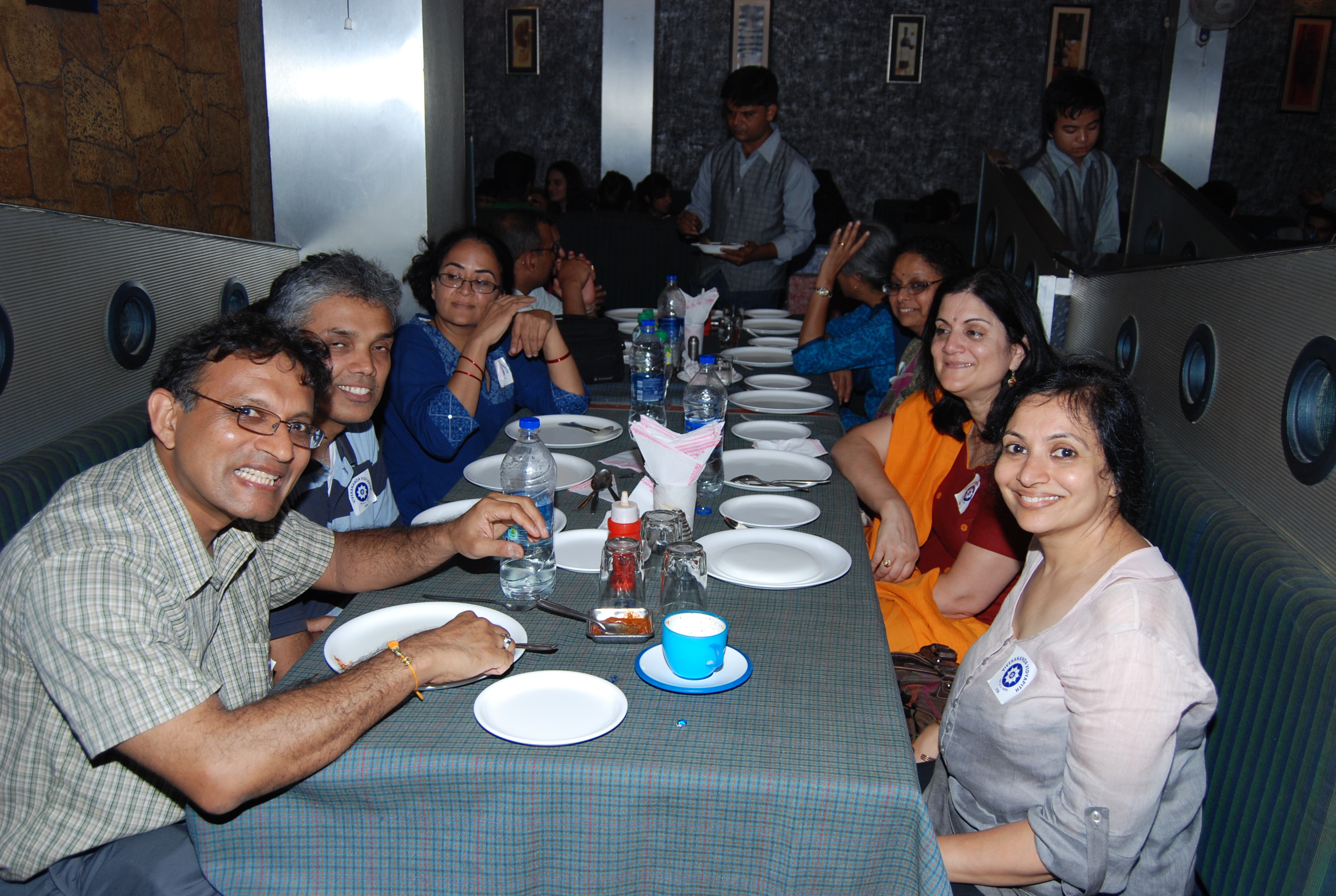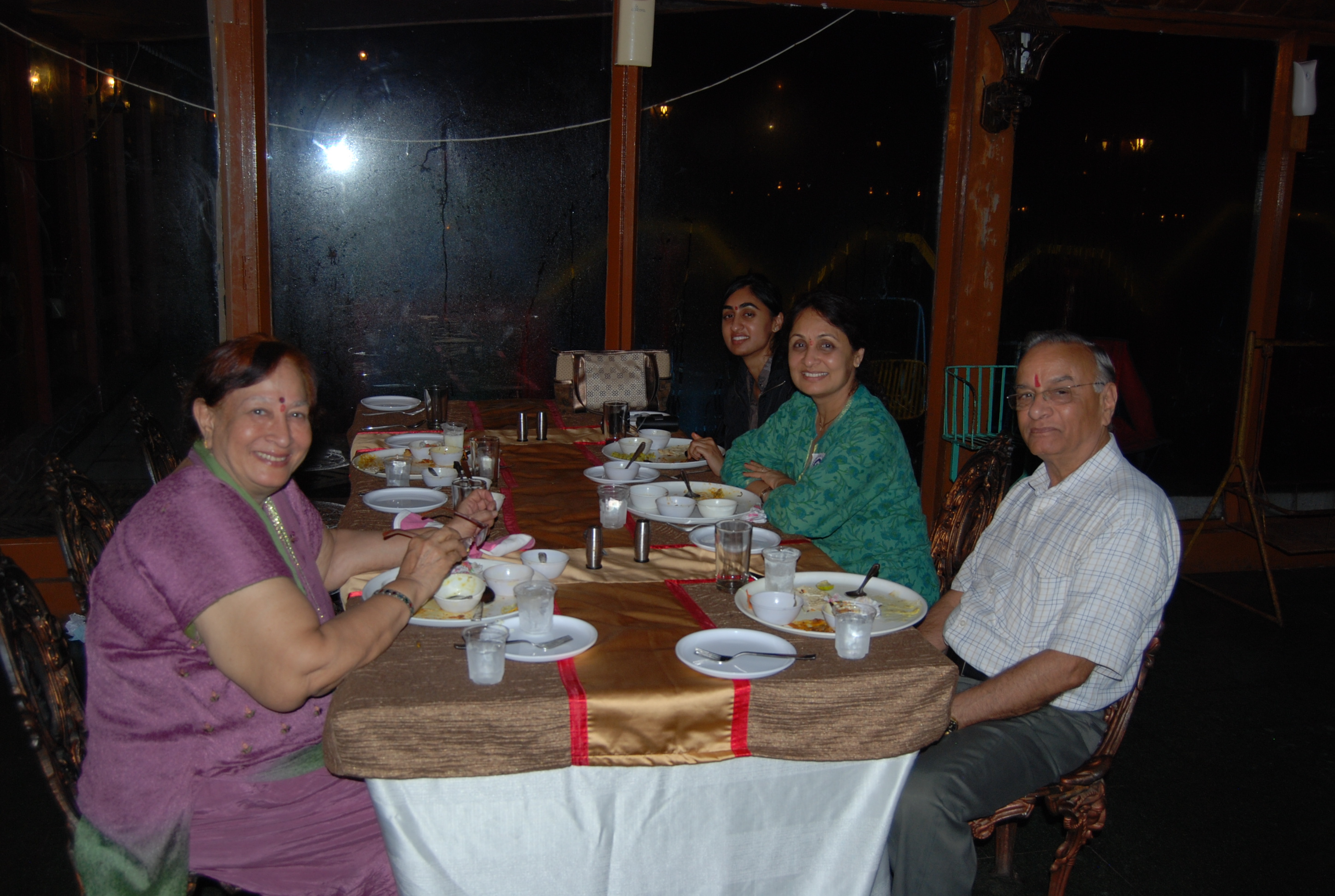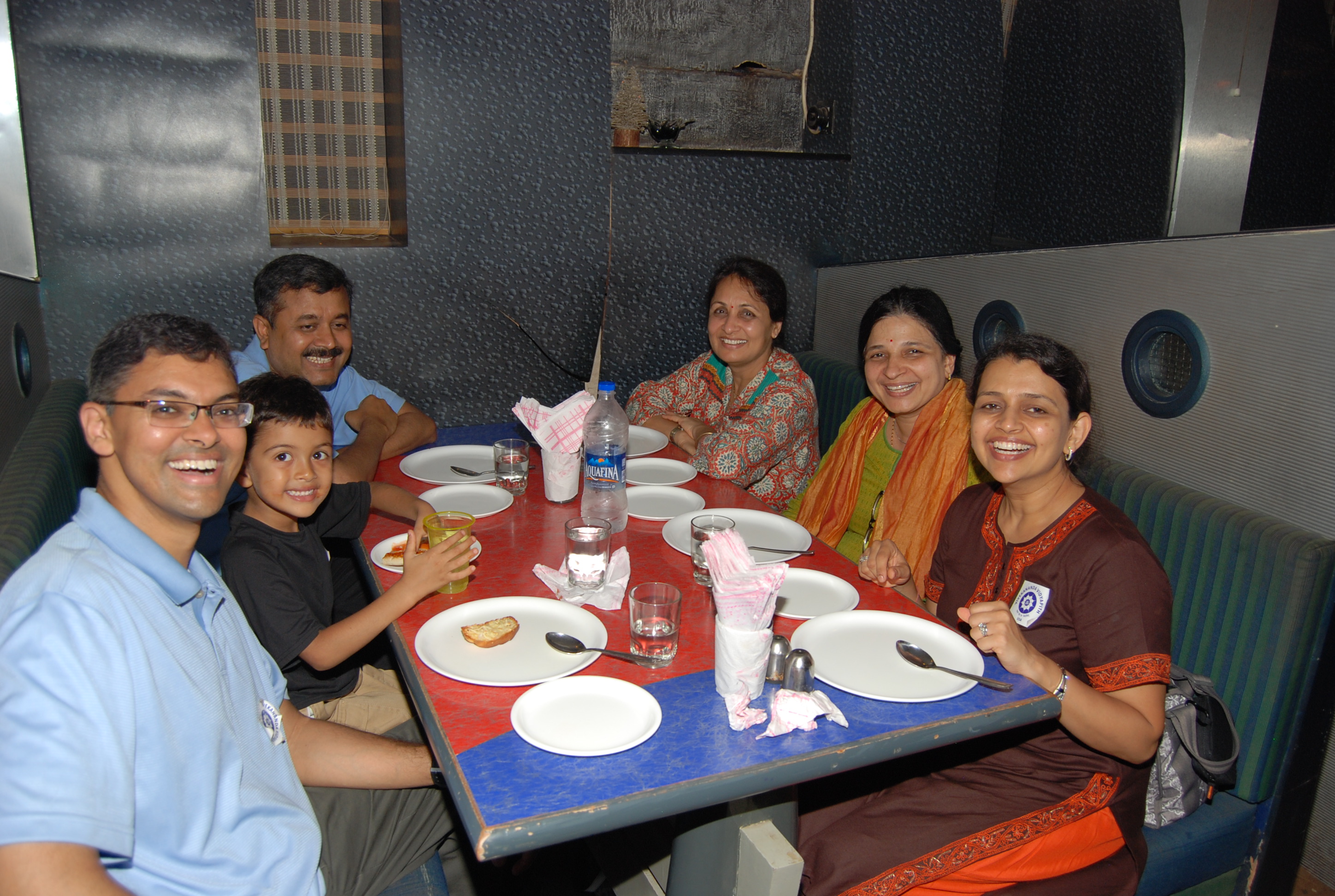 Within half an hour we arrived at the Surya Hotel. As soon as we entered into a decorative and well-lit reception room, we found a sign that said, “Welcome to delegates of Vidyapith Family, New Jersey. @5th Avenue Hall (5th floor)” We went to the 5th floor and there was a similar sign at the door. It was a special dinner. The dinner was hosted by Mukundbhai and Maltiben & Family. They welcomed us inside a big banquet room. Decorative table-cloths, chairs covered with white covers, special lights, and people created a very good mood for dinner. Some soft drinks were served. People got some time to talk to each other. Soon, the room was full of joyful noise. Nisha introduced the host family members. People then enjoyed appetizers, the main course menu items, and deserts. There was a family oriented environment in the hall. After desert, everyone received a gift of the book, “In Indian Culture, why do we…” All were very happy by the loving hospitality of the host. While going home, there was no bus and because of rain it was difficult to get many rickshaws. So, Nimishbhi and Mukundbhai’s son Kunalbhai gave rides to all of us from the Surya hotel to the Royal Orchid Central hotel. For this, they had to make several trips between the hotels.
