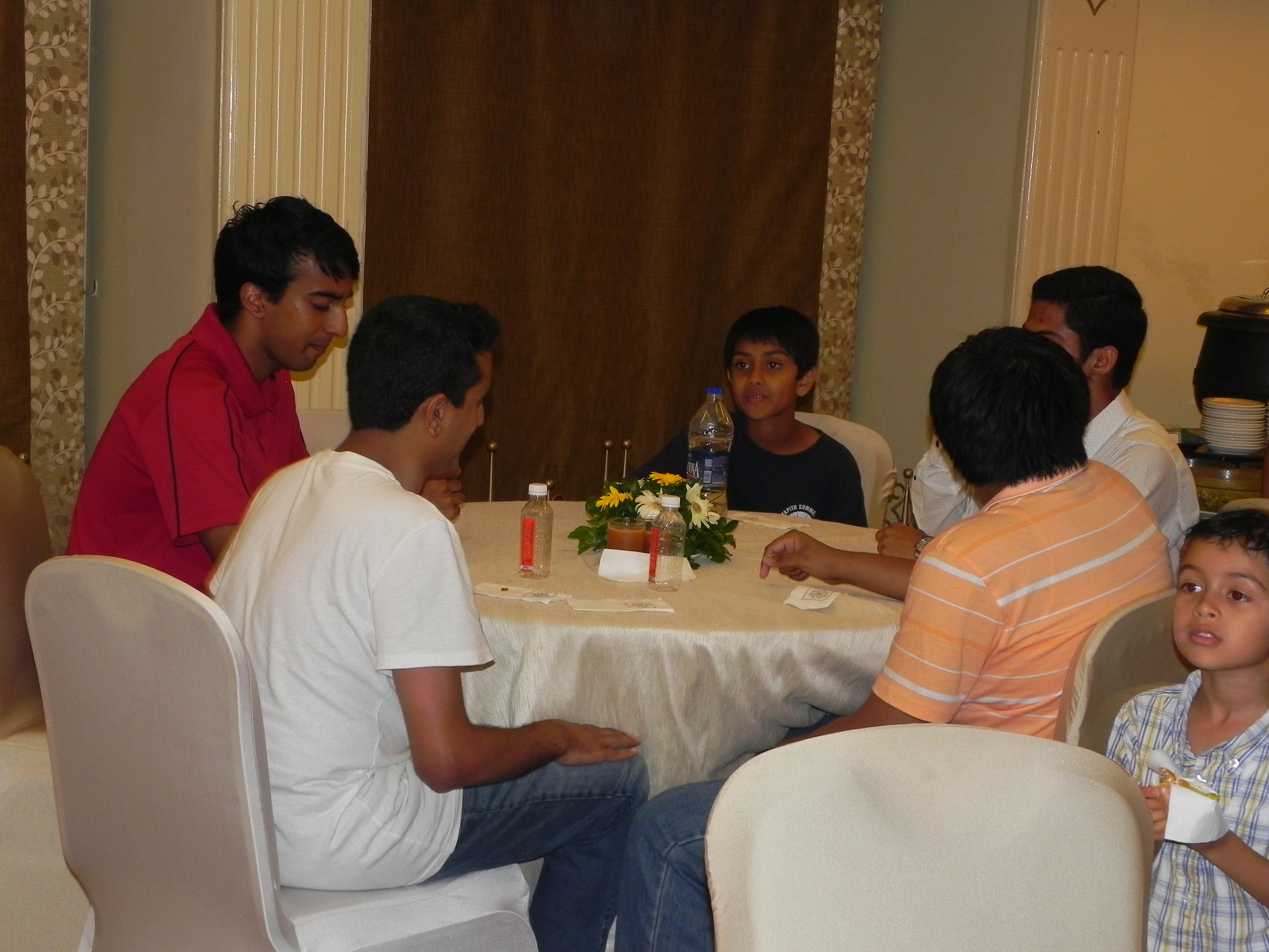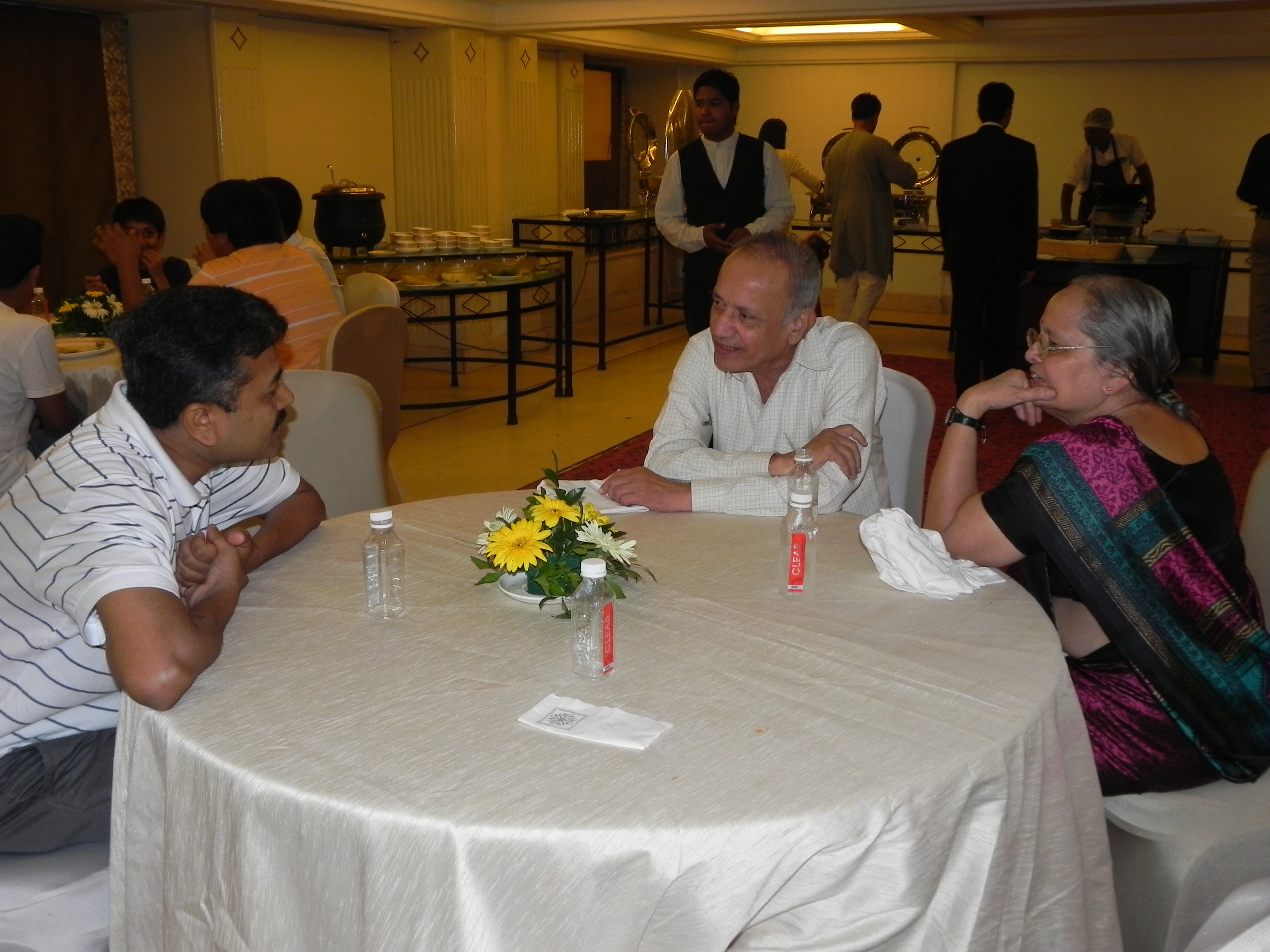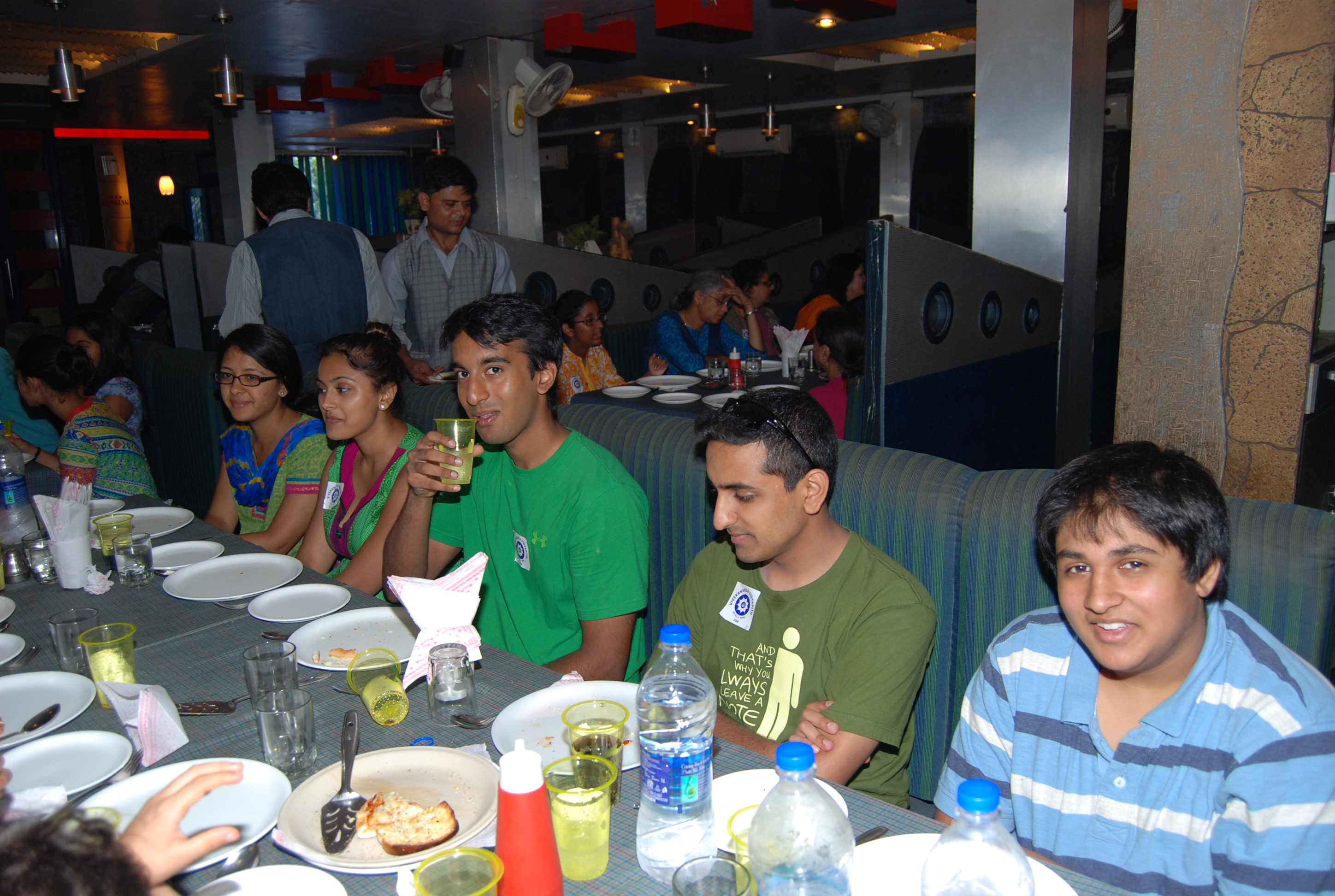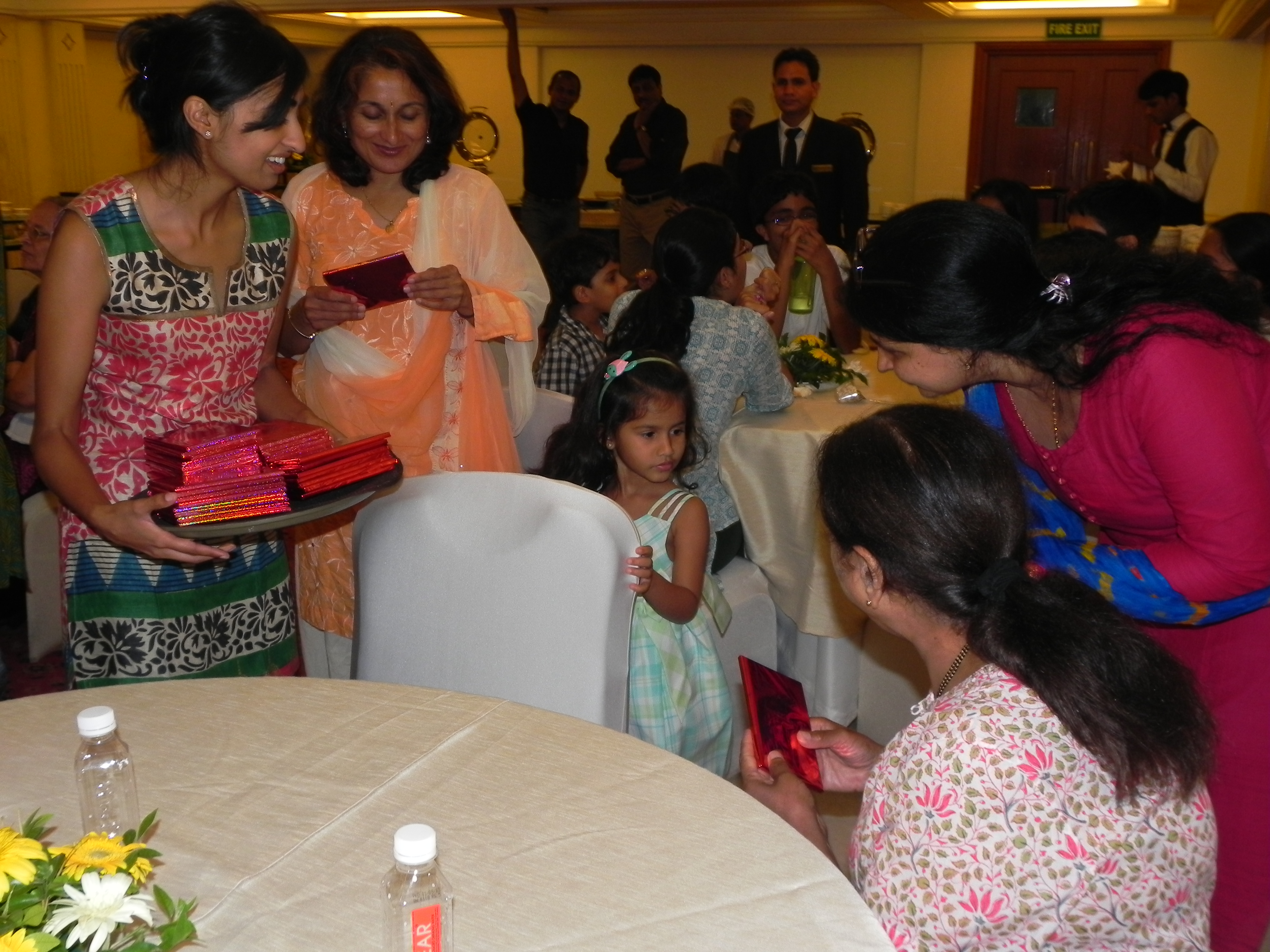 Within half an hour we arrived at the Surya Hotel. As soon as we entered into a decorative and well-lit reception room, we found a sign that said, “Welcome to delegates of Vidyapith Family, New Jersey. @5th Avenue Hall (5th floor)” We went to the 5th floor and there was a similar sign at the door. It was a special dinner. The dinner was hosted by Mukundbhai and Maltiben & Family. They welcomed us inside a big banquet room. Decorative table-cloths, chairs covered with white covers, special lights, and people created a very good mood for dinner. Some soft drinks were served. People got some time to talk to each other. Soon, the room was full of joyful noise. Nisha introduced the host family members. People then enjoyed appetizers, the main course menu items, and deserts. There was a family oriented environment in the hall. After desert, everyone received a gift of the book, “In Indian Culture, why do we…” All were very happy by the loving hospitality of the host. While going home, there was no bus and because of rain it was difficult to get many rickshaws. So, Nimishbhi and Mukundbhai’s son Kunalbhai gave rides to all of us from the Surya hotel to the Royal Orchid Central hotel. For this, they had to make several trips between the hotels.