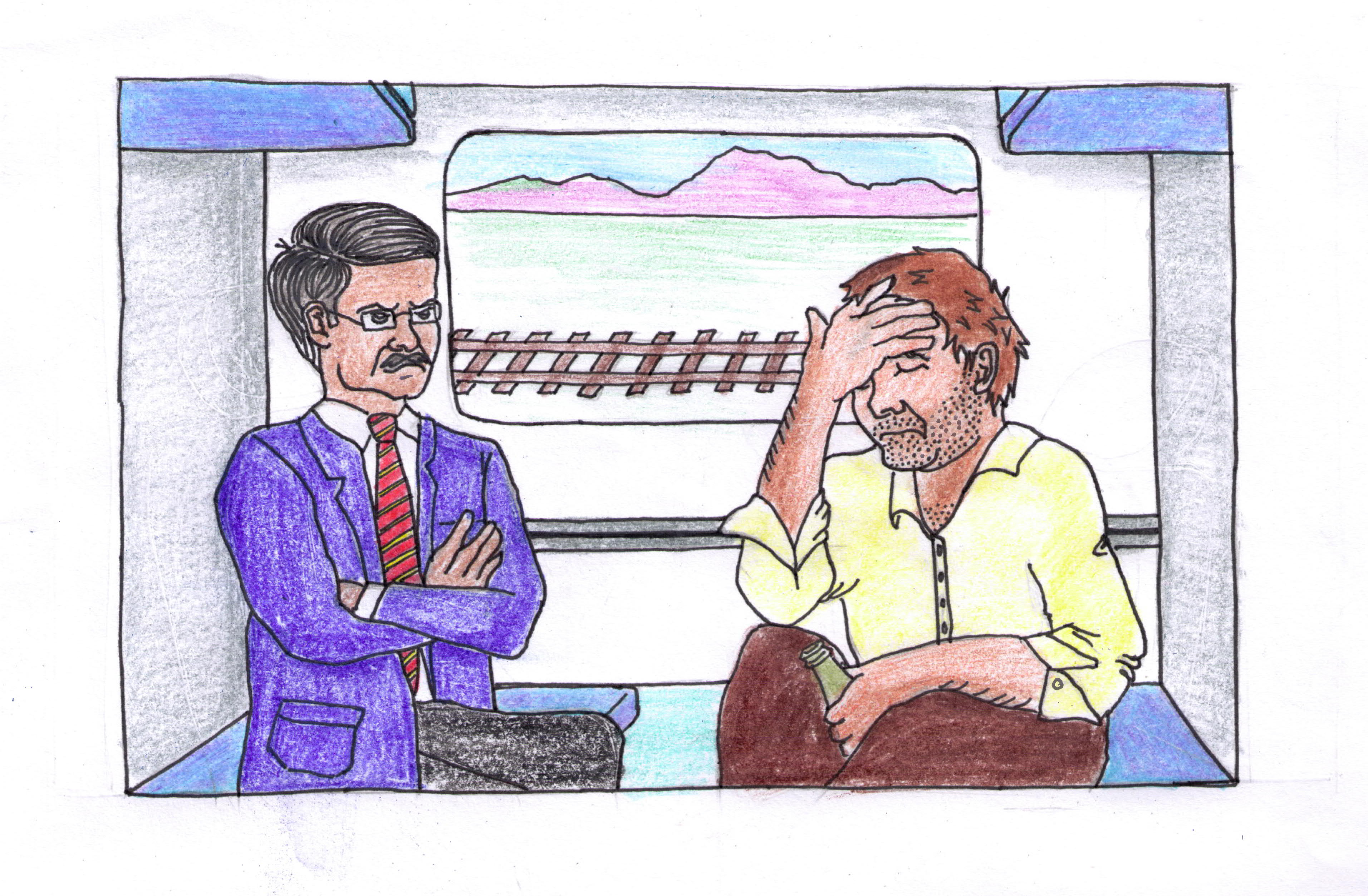 After getting on and off the wrong train five times, finally, someone helped him to get in a train that was going to Boston. He saw a well-dressed gentleman sitting on a berth. The gentleman was annoyed by the smell and appearance of the drunkard. The drunkard sat a little bit away from this gentleman.