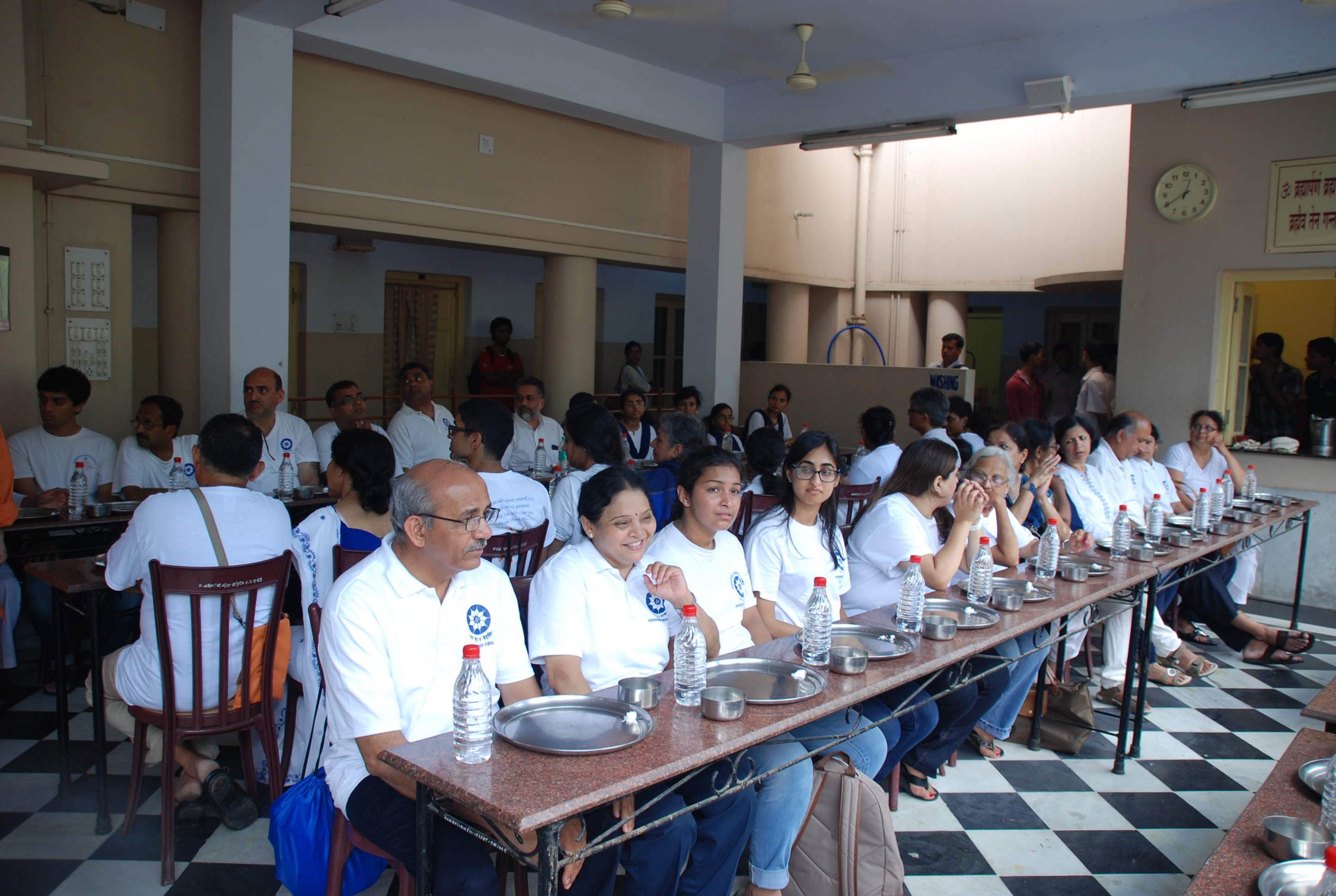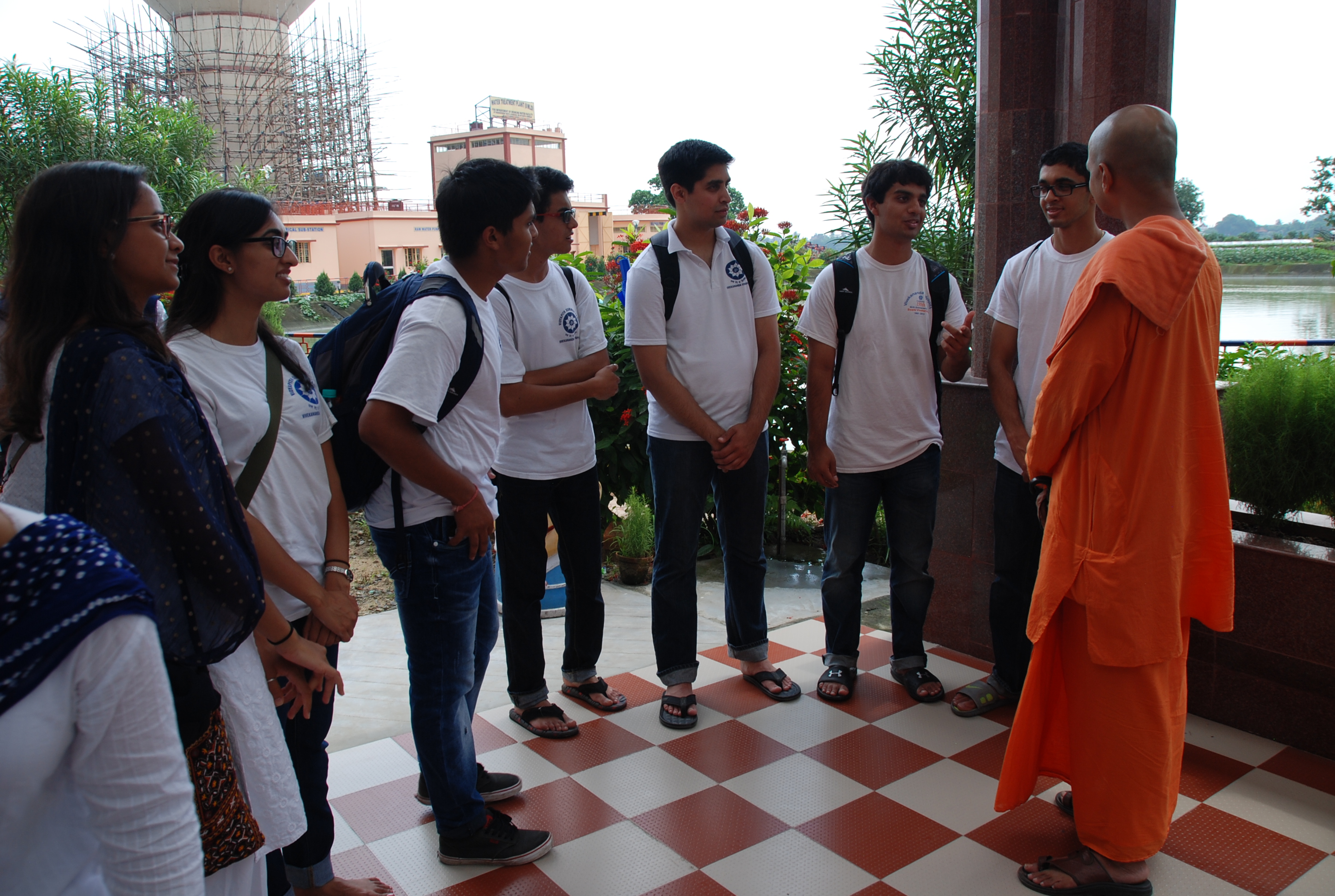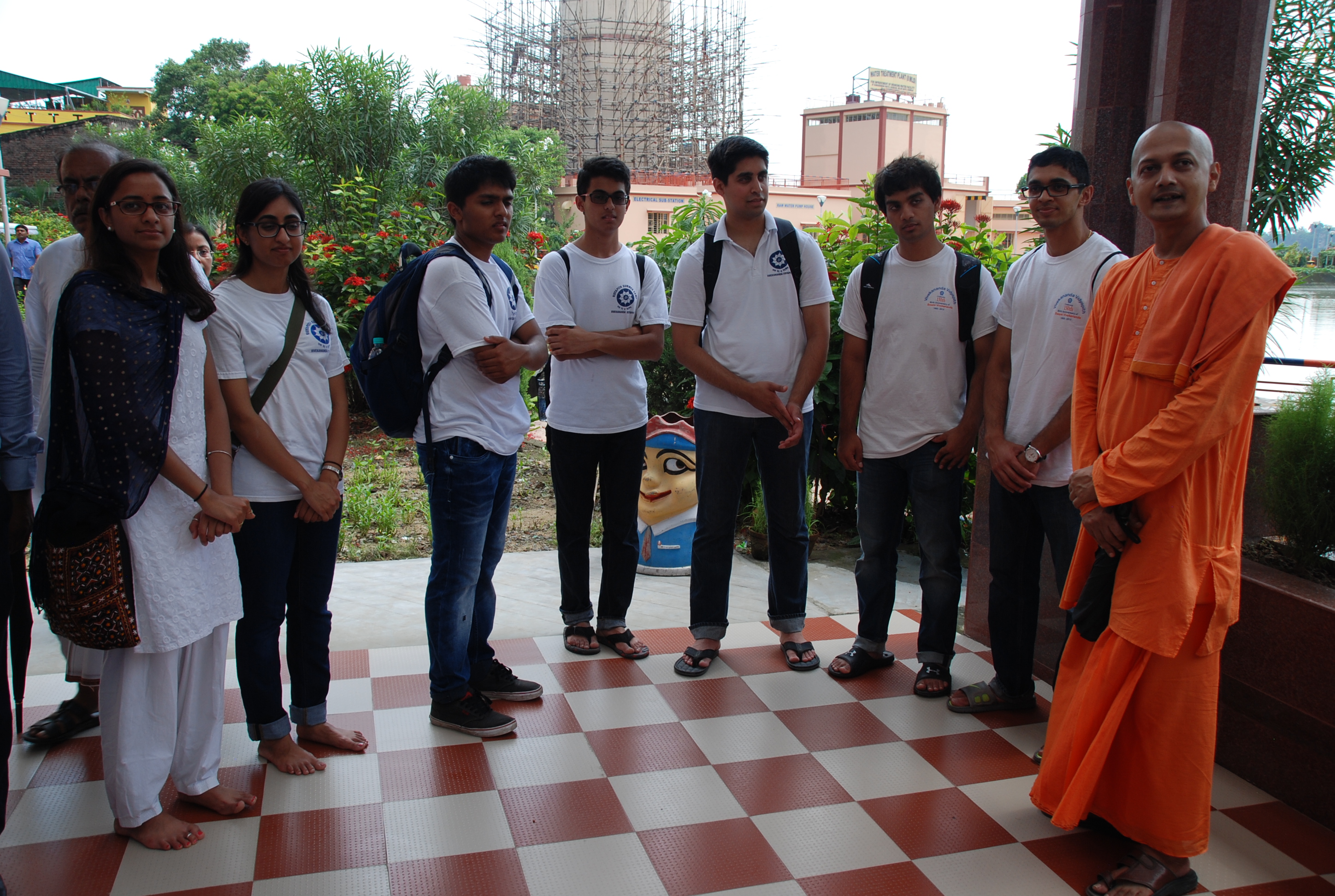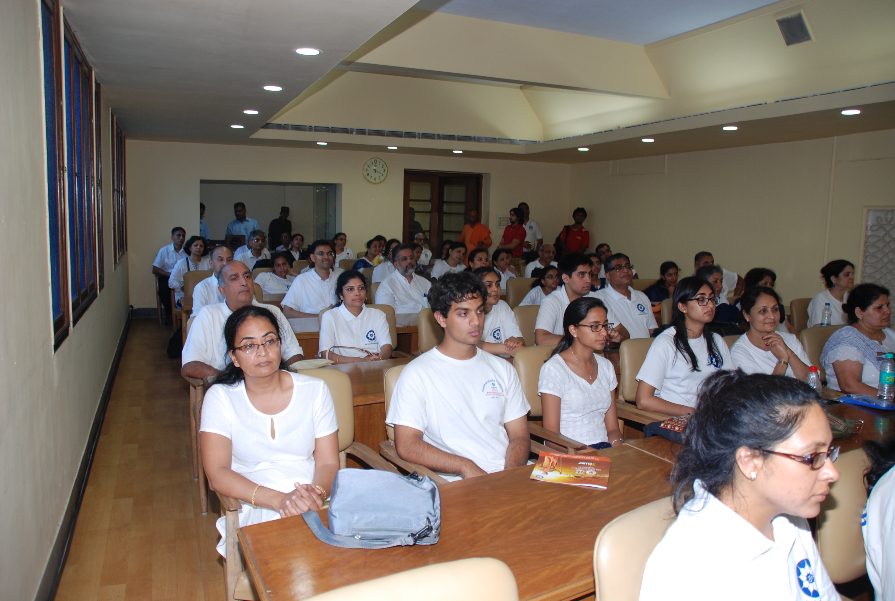 All 100 of us (91 Vidyapith pilgrims + guides + Club 7 members) soon arrived at the main entrance of the Institute. We entered and eagerly awaited Revered Tapan Maharaj who shortly came running in to greet us. It was an air-conditioned building. All were feeling very comfortable.