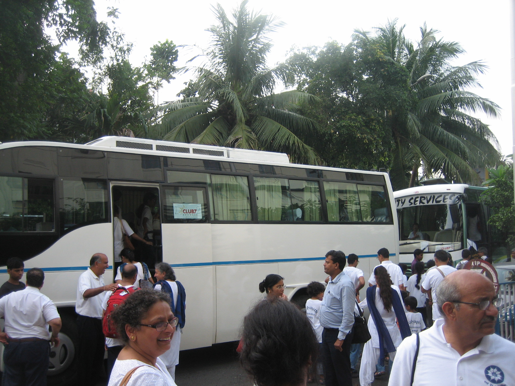 After having a wonderful time, scrumptious meal, and feeling fully satisfied with the first part of our pilgrimage at the Belur Math, we all got into our assigned buses and headed to the Ramakrishna Mission Institute of Culture. The bus ride was about an hour and half to the Institute. It was not the distance, but the traffic and narrow roads, which added to the time. However, our pilgrims made the most of it and there was nothing to worry about. The air-conditioning in the buses was at full blast and the reclining cushioned chairs were very comfortable. Some caught up with their sleep while others sang bhajans and dhuns. The “Bhajans and Dhuns Book,” which was specially made for the pilgrimage, was very handy. It helped all to join in on the singing.