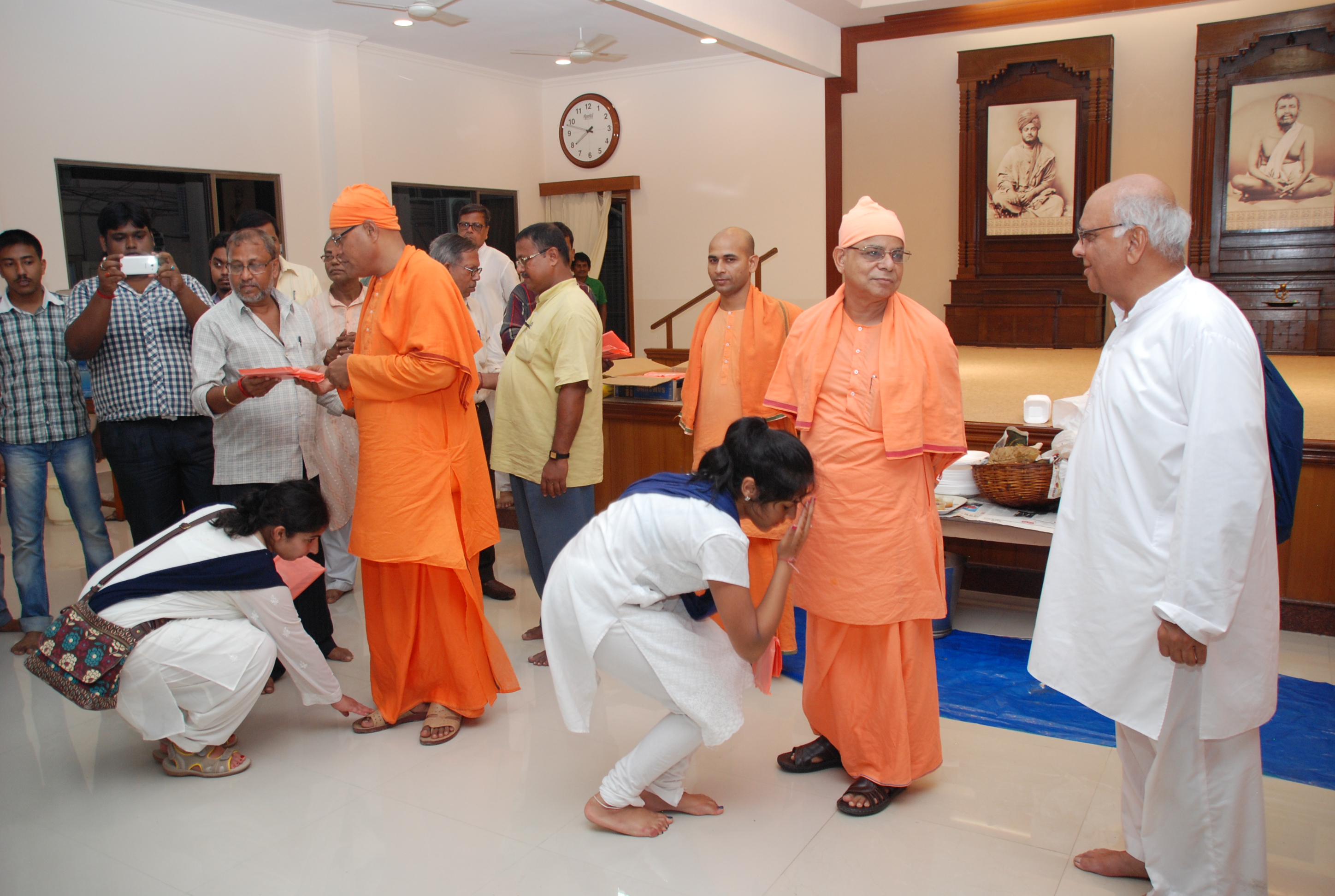 After saluting Thakur, Maa, and Swamiji, we all gathered again in the hall to take a leave of the Swamis. To our surprise, we found that they had gift ready for each individual of Vivekananda Vidyapith. Uncle had requested Swaami Nityamuktananda (Ganesh Maharaj), Spiritual Head of Ramakrishna Math, Yogodyan, to bless us all. He was kind enough to come to the hall. He gave gifts to the remaining people and blessed us all. Their love for all of us and joy of giving the gifts were visible on their faces.