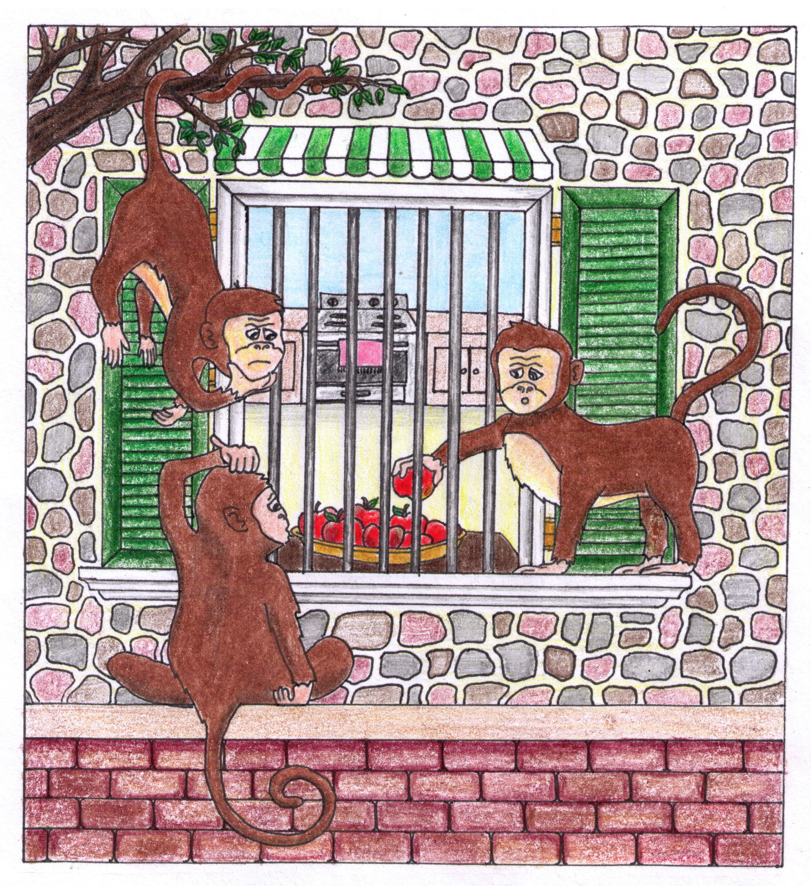 A group of monkeys is made out of a family or a few families. One such group of monkeys was jumping on the terraces of houses looking for food. Among them was a small monkey who was learning all the monkey tricks and ways to get food. He was jumping around and all of a sudden he saw an apple lying inside a grilled window. It was a big, red apple. Any mouth becomes watery by seeing this apple. The little monkey jumped to the window, extended its hand inside the grille, and grabbed the apple.