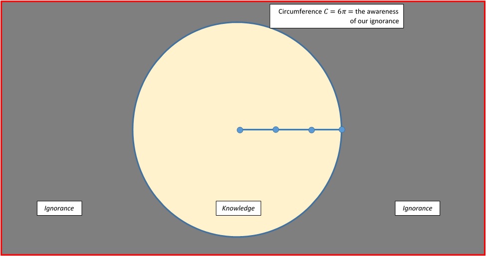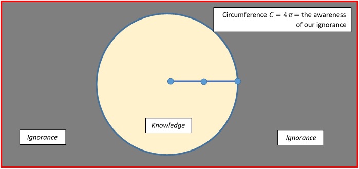 The area inside the circle represents all the knowledge that exists between all human beings on the earth. The area outside the circle represents our ignorance. Suppose the radius of the circle is 2 units. Then, the circumference will be C = 2 x (Pi) x (2) = 4 (Pi).