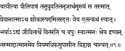 Shloka – 9: Because of which a person loves one’s own body, spouse, children, and wealth, that Atman is the most lovable thing. All things other than the Atman are the cause of suffering. Therefore, all things other than the Atman are not pleasurable. One who is seeking the highest good of oneself is ready to sacrifice one’s own life, family, relatives, and all other things. Therefore a wise person should make all the efforts to realize the Atman only and nothing else.