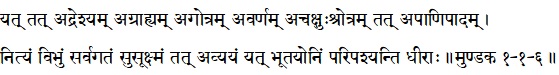 “By means of the Higher Knowledge, the wise behold everywhere Brahman, which otherwise cannot be seen or seized, which has no root or attributes, no eyes or ears, no hands or feet; which is eternal and omnipresent, all-pervading and extremely subtle; which is imperishable and the source of all beings.”