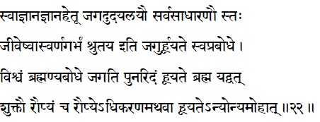 Meaning: The Vedas say that there is a universal rule applicable to all, from the creator Brahma to an individual: ‘Because of ignorance we see the world and when we realize Atman (or Brahman), the world disappears’. Because of illusion we see silver in the nacre, but when we know ‘it is nacre’, the silver merges into the nacre. Actually, there was no silver at all. Similarly, in the state of ignorance, Brahman merges in the world, and after the realization of Brahman, the world merges in Brahman.