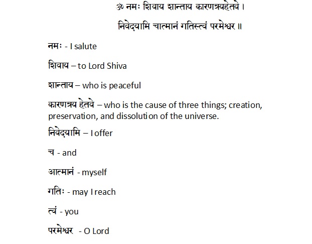 Meaning: I salute Lord Shiva who is peaceful, auspicious, and the cause of the creation, preservation, and dissolution of the universe. O Lord Shiva! I surrender myself to you. May I realize you.
