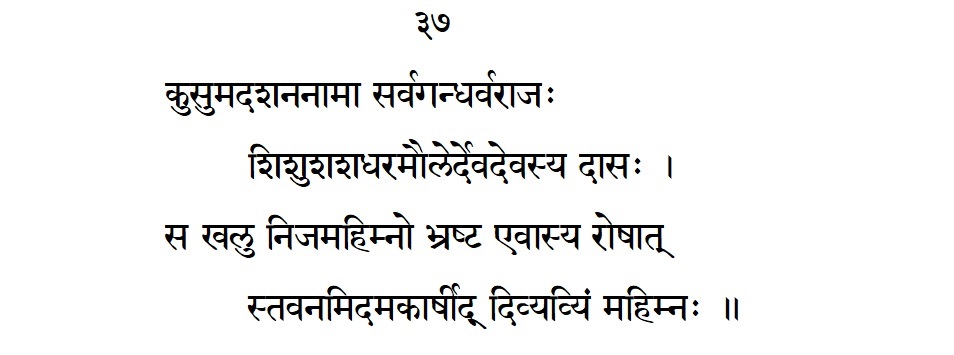 Since the Shiva Mahiman Shlokas 33 – 43 describe the story of the Pushpadanta and the glories of the hymn, it is not clear whether he composed these shlokas or they were added by some other people. Common sense tells us that this shloka might not have been composed by him. However, the shloka is well-composed, and no harm in singing it.