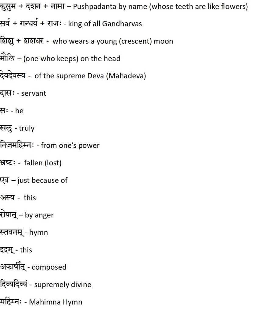Meaning: Pushpadanta, the king of Gandharvas, was a servant of the supreme Lord Shiva who wears the crescent moon on his head. Because of Lord Shiva’s anger, he lost all his power, and he composed this supremely divine hymn, called Shiva Mahimna.