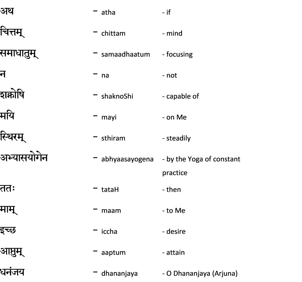 If you cannot focus your mind steadily on Me, then O Dhananjaya, desire to attain to Me through the Abhyasa Yoga (Yoga of constant practice).