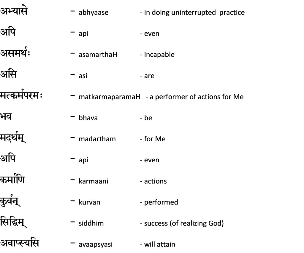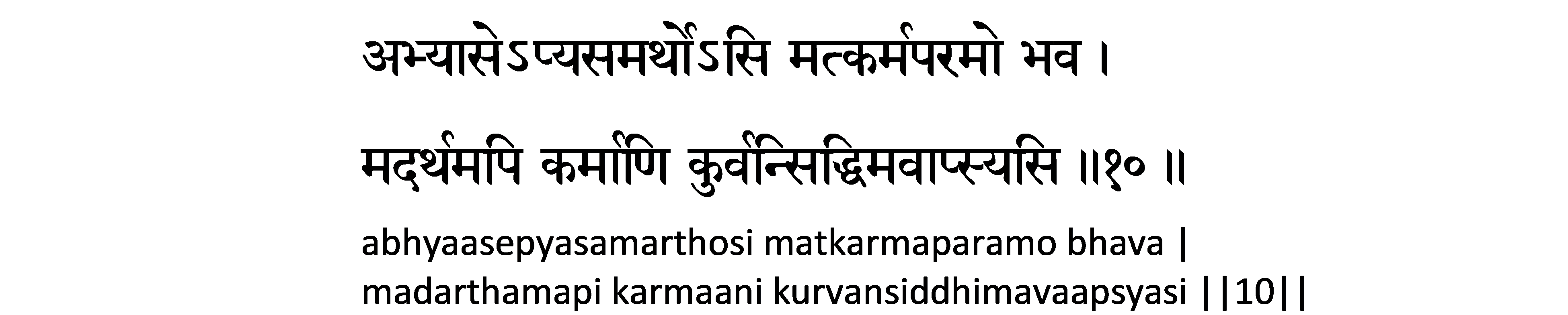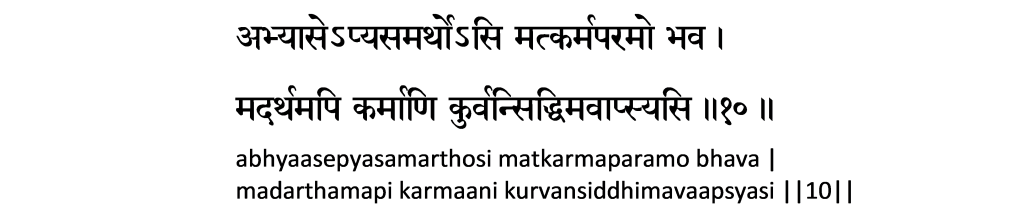 10. If you are incapable of practicing Abhyasa Yoga (Yoga of constant practice), then perform actions for Me. Even by performing actions for Me, you will attain perfection (the realization of God).