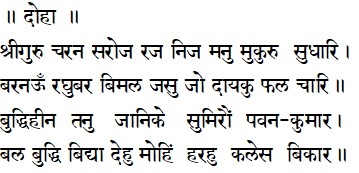 (1) I join with Saint Tulsidasji in his beginning prayer consists of the two dohas and request Shri Hanumanji to help me (i) purify my mind by surrendering to my spiritual Guru, (ii) remember the untainted glories of Lord Rama, (iii) understand that my intellect is limited and (iv) develop strength, pure intelligence, and acquire spiritual knowledge with which I can remove my fundamental ignorance which creates all the problems of my life. The fundamental ignorance is that I forget my true divine nature and start thinking that I am nothing but my body and mind.
