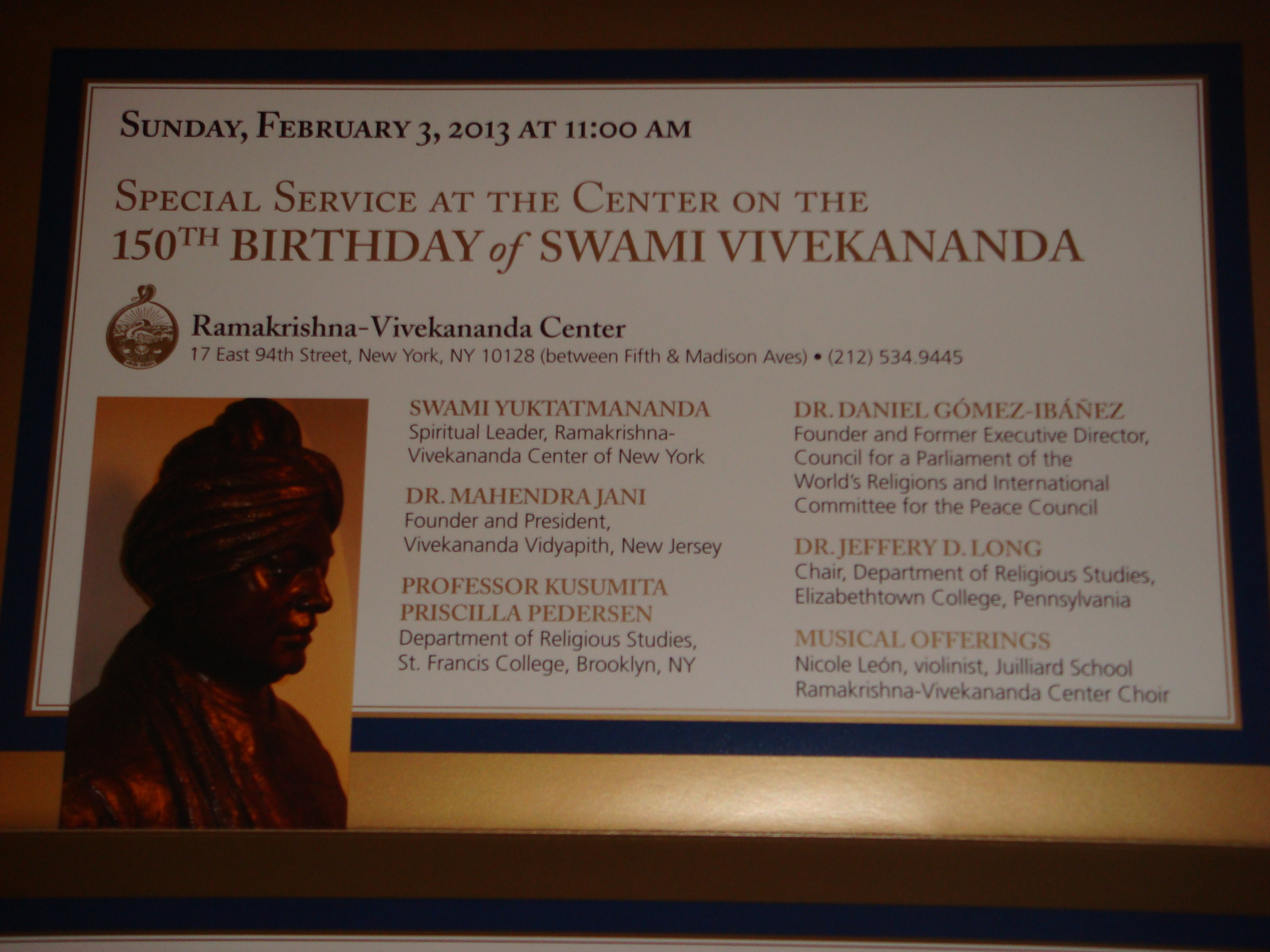According to the Hindu calendar, Sunday, February 3, 2013 was Swami Vivekananda’s actual 150th Birthday. I was fortunate to be invited by Revered Swami Yuktatmananda, Spiritual Head of Ramakrishna Vivekananda Center, 17 East, 94th St., New York, as one of the four speakers to share my thoughts. My topic was “The Essential Spiritual Message of Swami Vivekananda.”